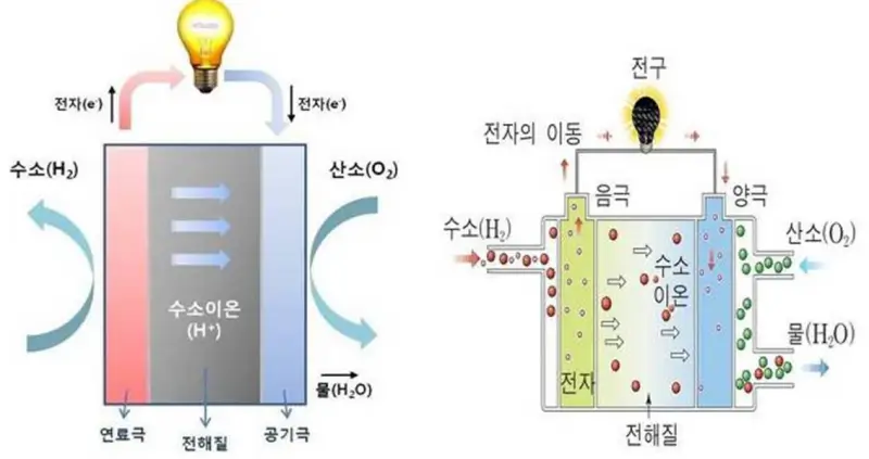 연료전지 스택 내에서 전기가 발생되는 과정은 배터리의 방전과 동일합니다.